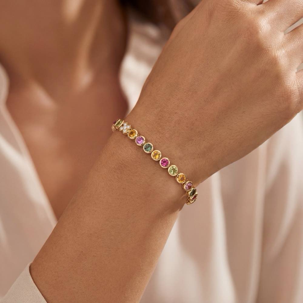 Farbenfrohes Rivieren-Armband mit weißen Diamanten, gelben Citrinen, rosa und dunkelgrünen Turmalinen und hellgrünen Peridots. Moderne und kräftige Zargenfassungen. In feiner Handarbeit in Gelbgold 750/- gearbeitet.