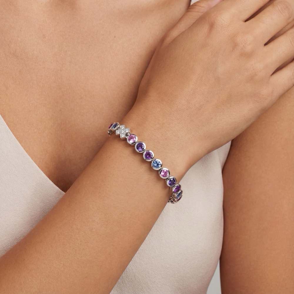 Farbenfrohes Rivieren-Armband mit weißen Diamanten, blauen Saphiren, zart-violetten Amethysten und intensiv-violetten Iolithen. Moderne und kräftige Zargenfassungen. In feiner Handarbeit in Weißgold 750/- gearbeitet.
