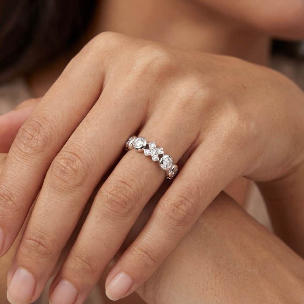 Sportlicher und außergewöhnlicher Memoire-Ring mit neun staatlichen weißen Diamanten. Ringbreite Large. In feiner Handarbeit aus Weißgold 750/- gearbeitet.