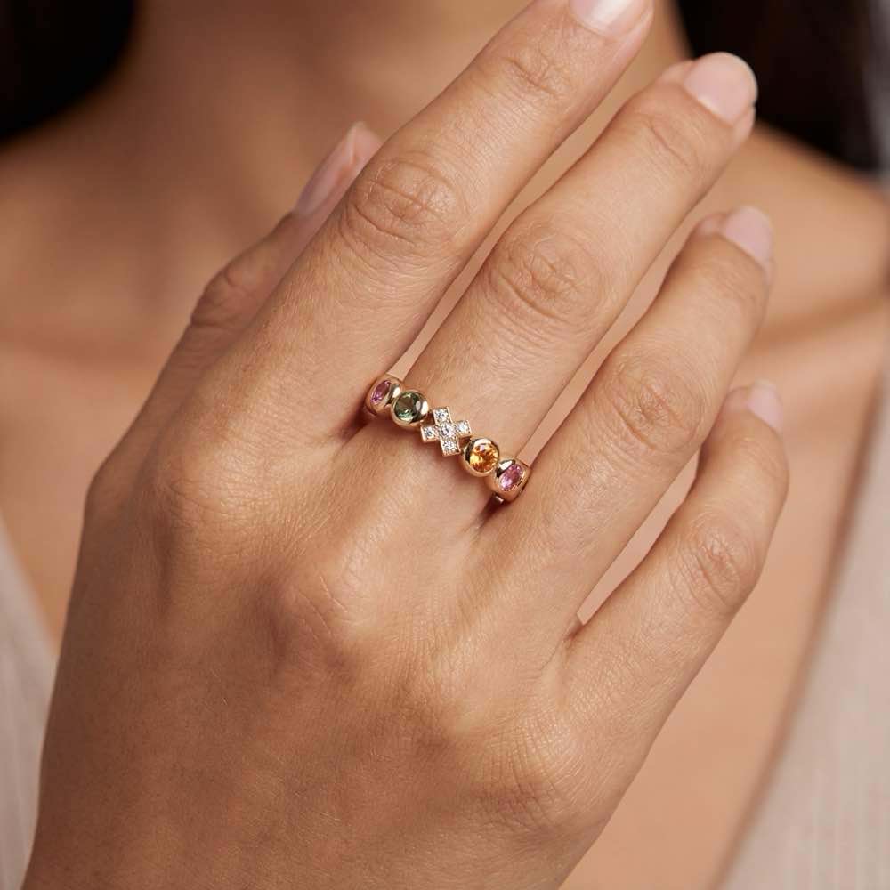 Sportlicher und außergewöhnlicher Ring im Memoire-Look mit verschiedenfarbigen Saphiren, rosaroten Turmalinen und weißen Diamanten. Ringbreite Medium. In feiner Handarbeit aus Roségold 750/- gearbeitet.