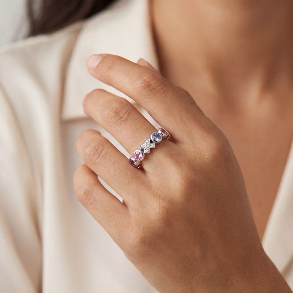 Sportlicher und außergewöhnlicher Ring im Memoire-Look mit blauen Saphiren, zart-violetten Amethysten, intensiv-violetten Iolithen und weißen Diamanten. Ringbreite Large. In feiner Handarbeit aus Weißgold 750/- gearbeitet.