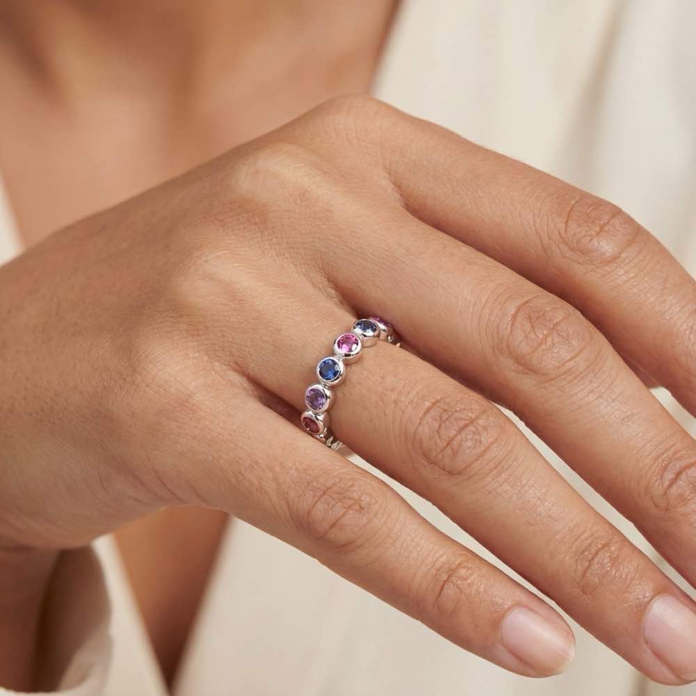 Sportlicher und außergewöhnlicher Ring im Memoire-Look mit blauen und rosa Saphiren, zart-violetten Amethysten und intensiv-violetten Iolithen. Ringbreite Small. In feiner Handarbeit aus Weißgold 750/- gearbeitet.