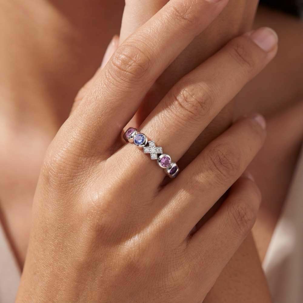 Sportlicher und außergewöhnlicher Ring im Memoire-Look mit blauen Saphiren, zart-violetten Amethysten, intensiv-violetten Iolithen und weißen Diamanten. Ringbreite Medium. In feiner Handarbeit aus Weißgold 750/- gearbeitet.