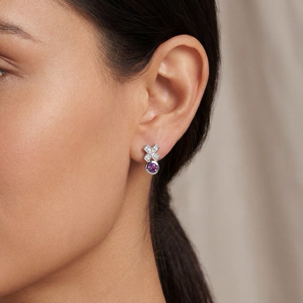 Frecher Ohrschmuck mit weißen Diamanten und violetten Amethysten. In feiner Handarbeit in Weißgold 750/- gearbeitet.