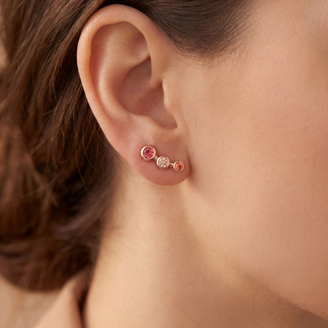 Frecher „Confetti“ Ohrstecker aus 18-karätigem Roségold mit einem Mix aus orangefarbenen Saphiren und einem champagnerfarbenen Diamant. Der Ohrstecker wird entlang der Ohrmuschel getragen.