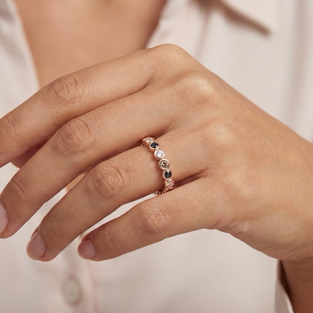 Ring Confetti aus der Kollektion City Garden mit einem Mix aus Saphiren, Diamant und champagner farbener Diamant. Gefertigt aus Roségold 18 Karat. Zwölf Edelsteine zieren diesen mittelgroßen Confetti Ring.