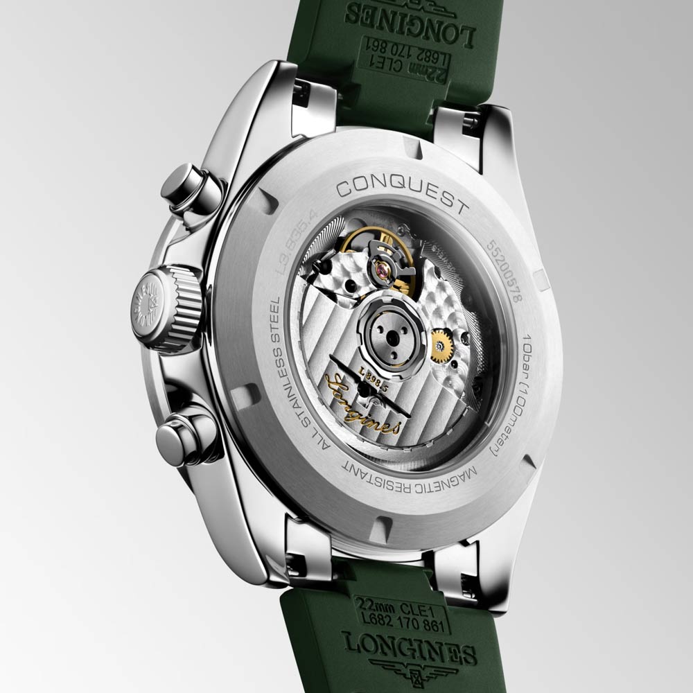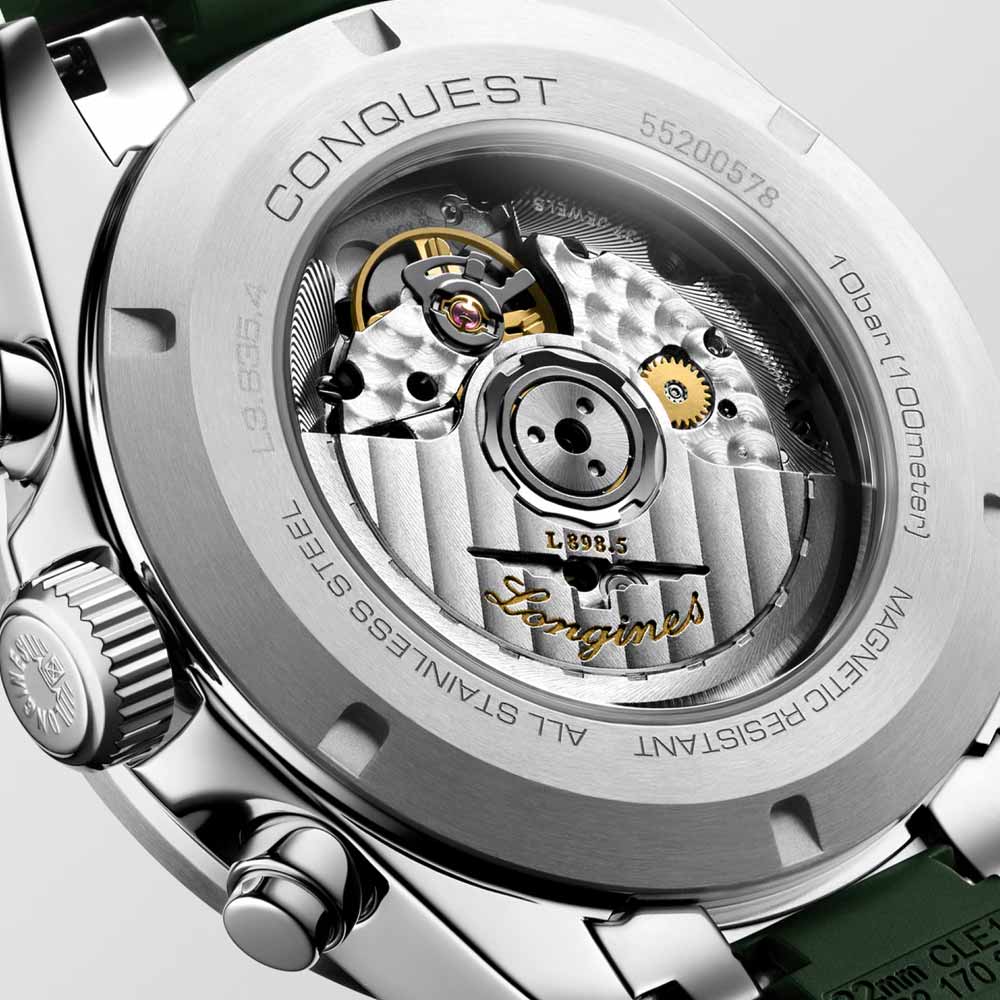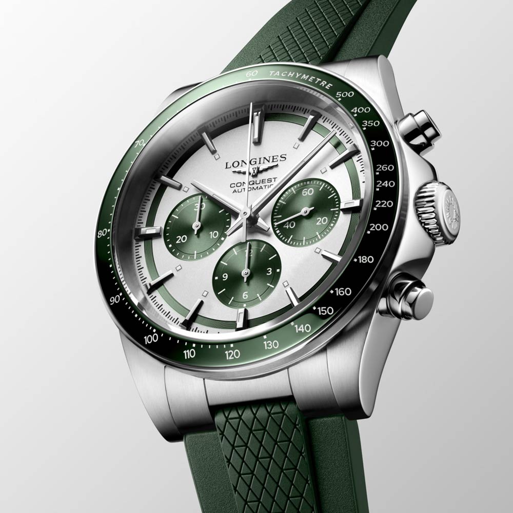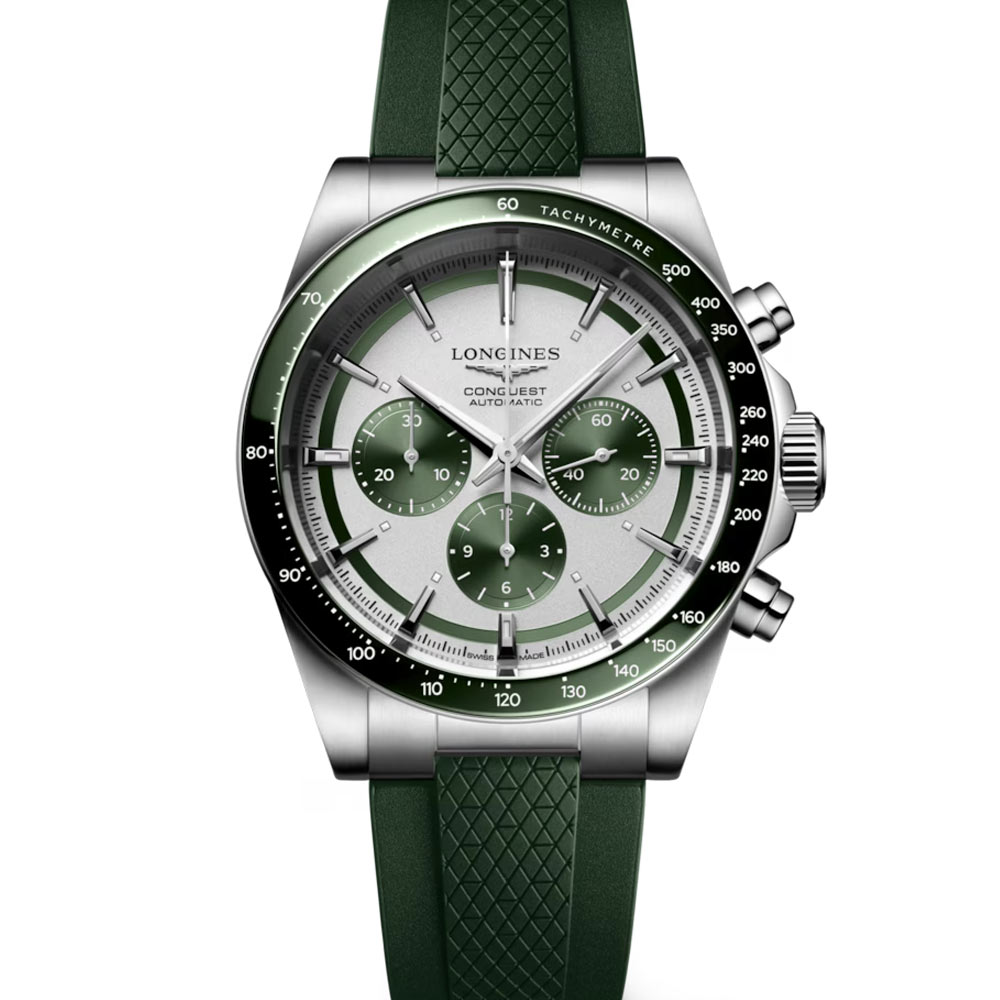 Longines Conquest in 42 Millimeter Durchmesser, Zifferblatt grün mit Metallsilber. Kratzfestes Saphirglas mit mehreren Antireflexschichten, mechanisches Uhrwerk mit Automatikaufzug. Kautschukarmband mit Faltschließe, Gehäuse in Edelstahl mit grüner Keramiklünette.