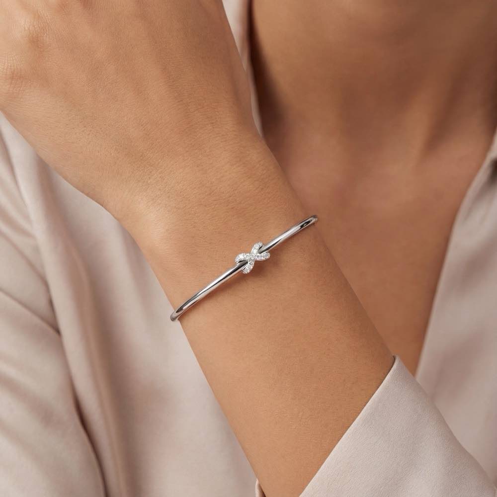 Lässige und flexible Armspange zum Überstreifen. Besetzt mit weißen Diamanten. In feiner Handarbeit aus Weißgold 750/- gefertigt.