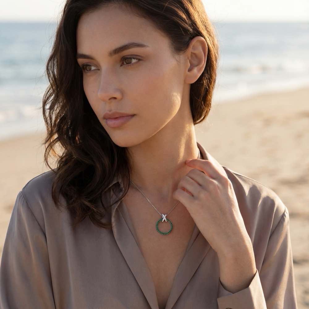 Formschöner und zarter Anhänger mit grünen Tsavoriten und weißen Diamanten. Modernes Collierkettchen im Ankermuster. In feiner Handarbeit aus Weißgold 750/- gearbeitet.