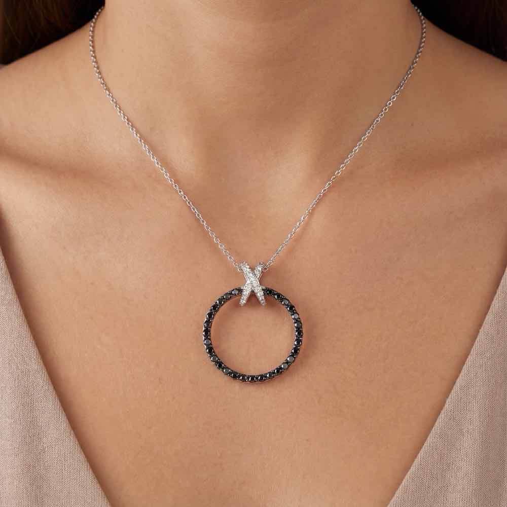 Formschöner und zarter Anhänger mit schwarzen und weißen Diamanten. Modernes Collierkettchen im Ankermuster. In feiner Handarbeit aus Weißgold 750/- gearbeitet.
