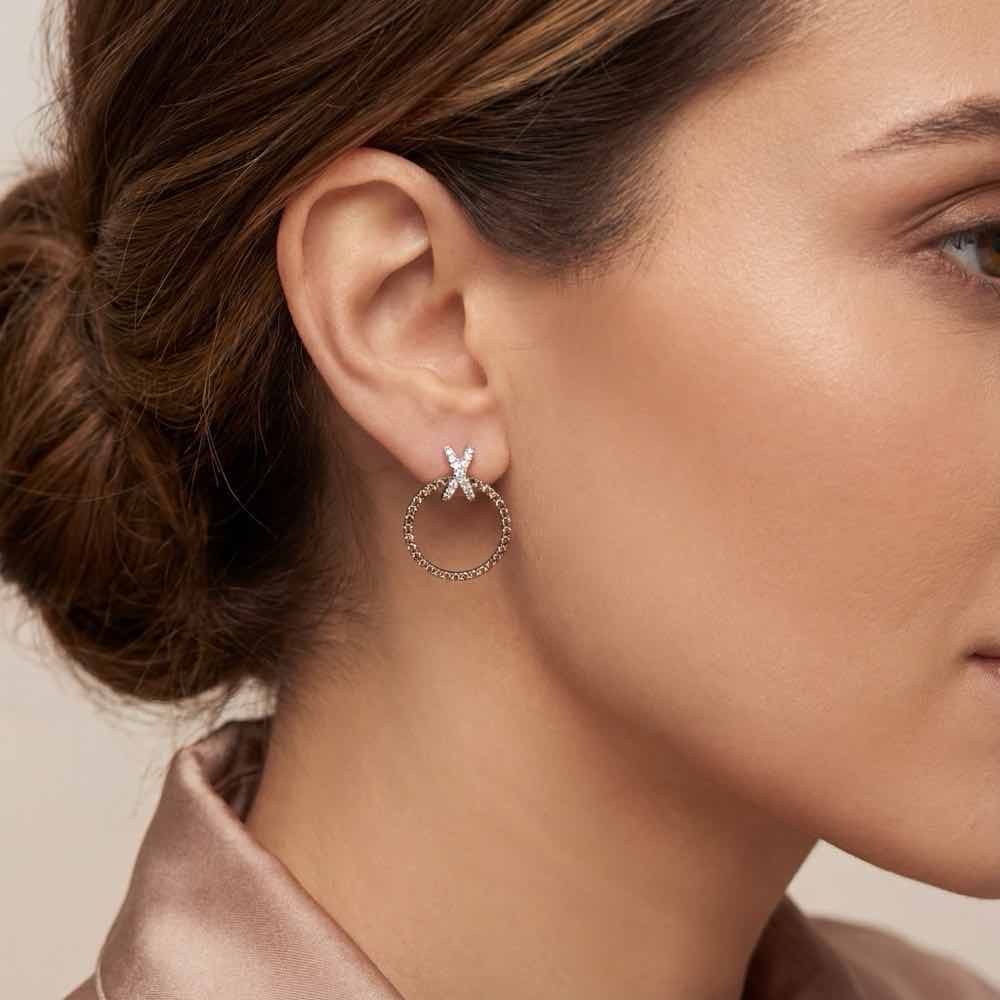 Formschöner und leichter Ohrschmuck mit braunen und weißen Diamanten. In feiner Handarbeit aus Rosé- und Weißgold 750/- gearbeitet.