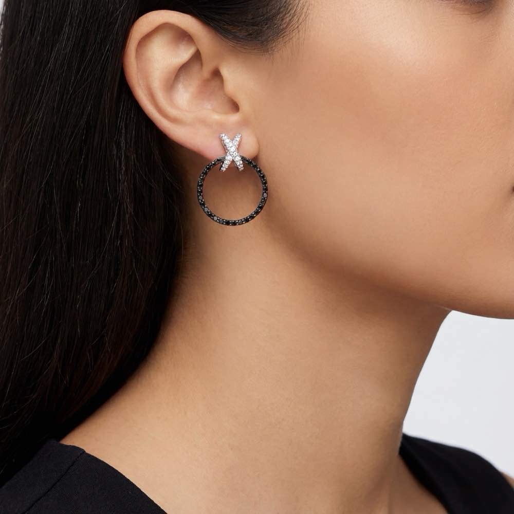 Formschöner und leichter Ohrschmuck mit schwarzen und weißen Diamanten. In feiner Handarbeit aus Weißgold 750/- gearbeitet.