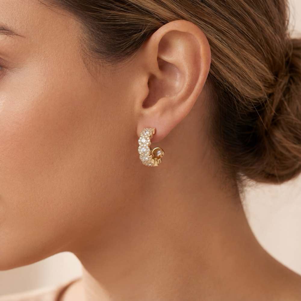 Einzigartig in Ausstrahlung und Glanz zeigt sich dieser edle Ohrschmuck mit zahlreichen, fein weißen Diamanten im runden Brillantschliff. Außendurchmesser 20 Millimeter (Größe "L"). Gefertigt wurden diese bezaubernden Ohrringe in feinster Handarbeit aus hochwertigem Gelbgold 750/-.
