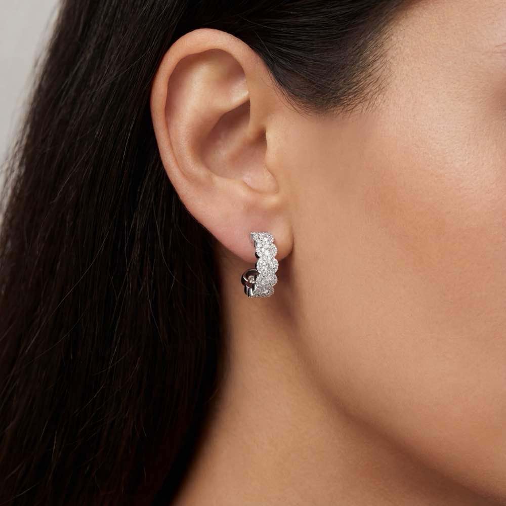 Zauberhafter Ohrschmuck mit zahlreichen fein weißen Diamanten im runden Brillantschliff. Außendurchmesser 20 Millimeter (Größe "L"). Exklusiv und mit strahlender Brillanz zeigen sich diese einzigartigen Ohrringe, gefertigt in feiner Handarbeit aus hochwertigem Weißgold 750-.