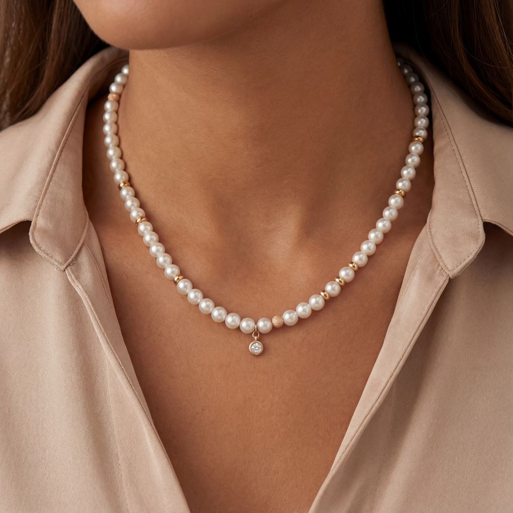 Strahlendes Delight Collier aus 18- karätigem Roségold, veredelt mit einem funkelnden Brillanten und leuchtenden weißen Ming-Zuchtperlen. Die variable Länge von ca. 42–45 cm macht es zu einem flexiblen und atemberaubenden Schmuckstück für jeden Anlass.