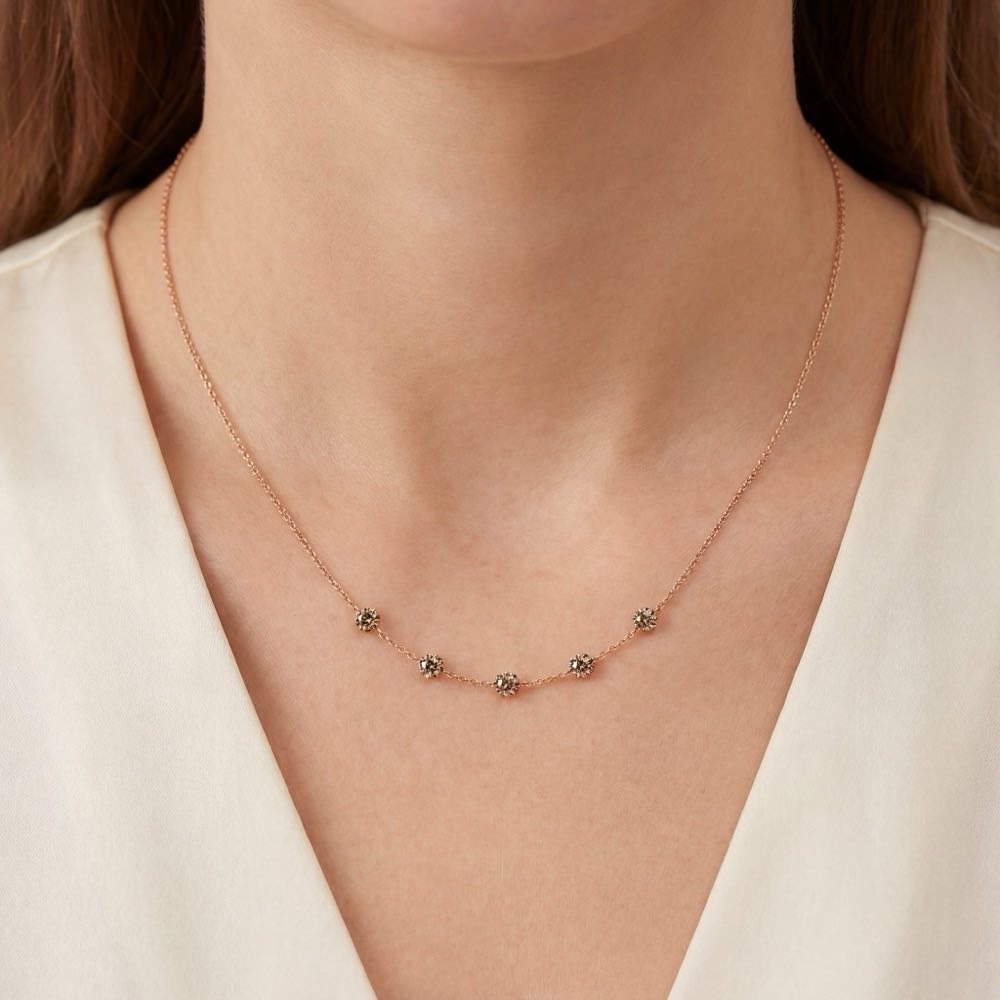 Ein stilvolles Collier in 42 cm Länge mit zimtfarbenen Brillanten. Dieses außergewöhnliche Collier veredelt charmant Ihre Garderobe und ist ein Begleiter für jeden Tag. Gefertigt in warmem Roségold 750/-.