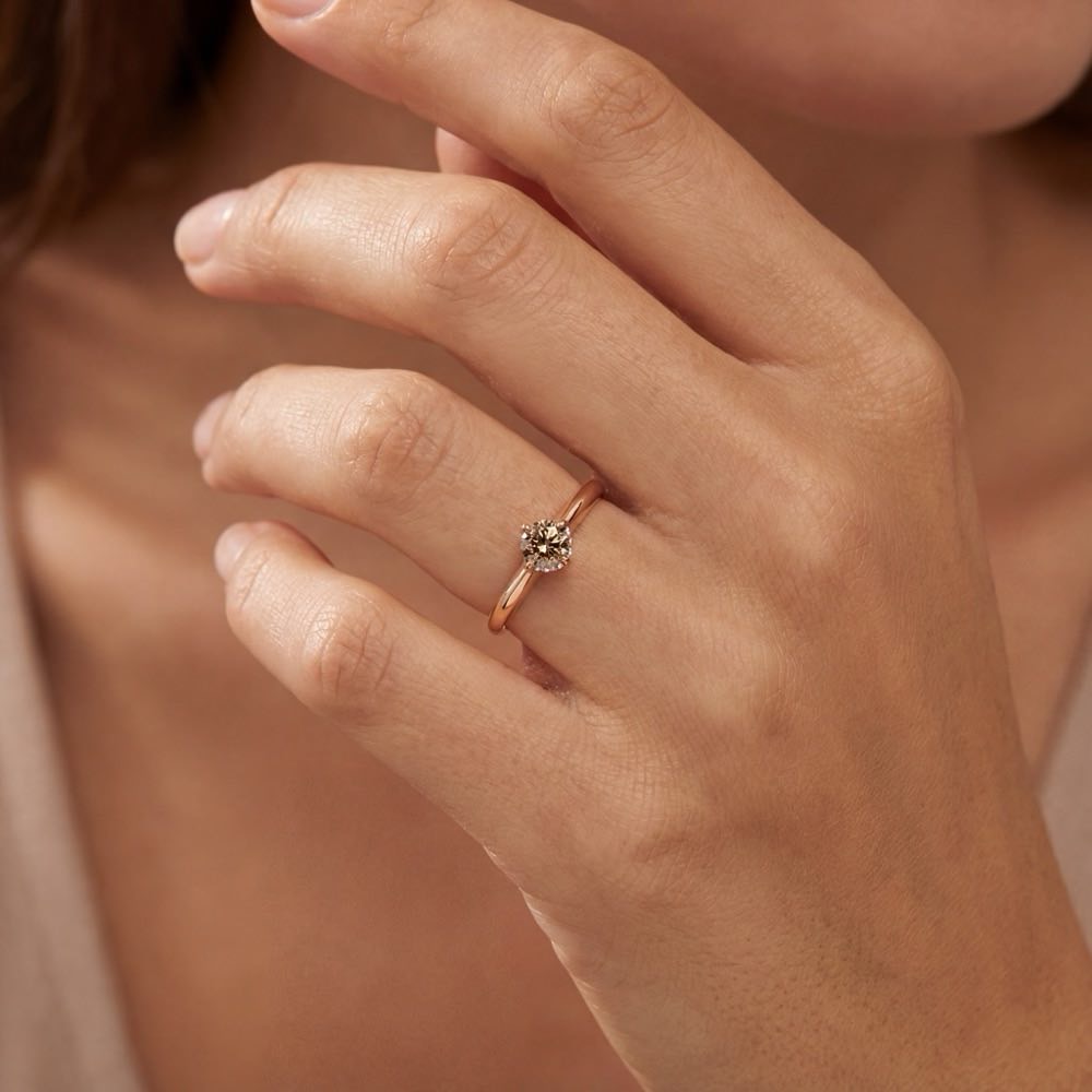 Bezaubernder Ring mit einem fantasiefarben braunen Diamanten im Brillantschliff im Zentrum. Unter dem Mittelstein verläuft dezent und zart ein Kranz aus fein weißen Diamanten. Ein charmanter Kontrast zu dem warmen und 18-karätigen Roségold.