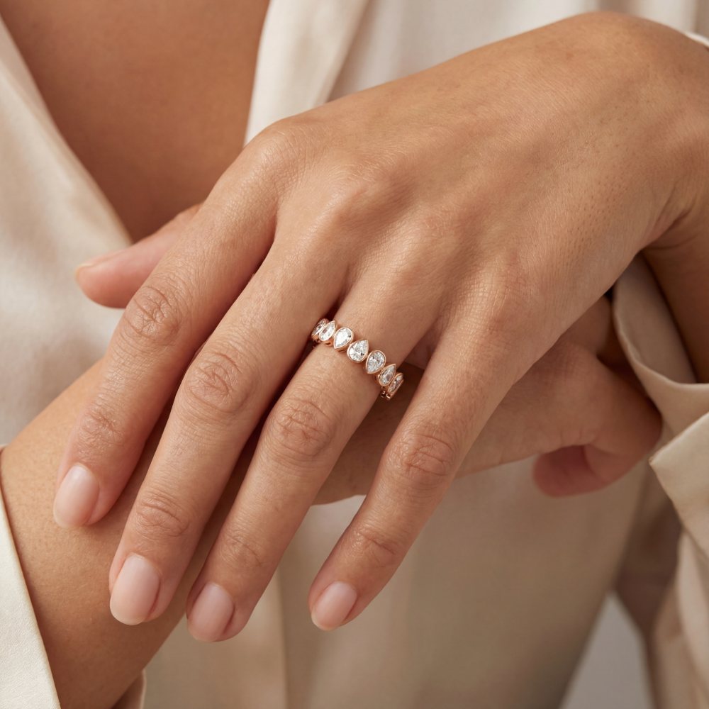 Außergewöhnlicher Ring mit aneinandergereihten ausdrucksstarken Diamanten im Tropfenschliff. In feinster Machart aus 18-karätigem Roségold gefertigt.