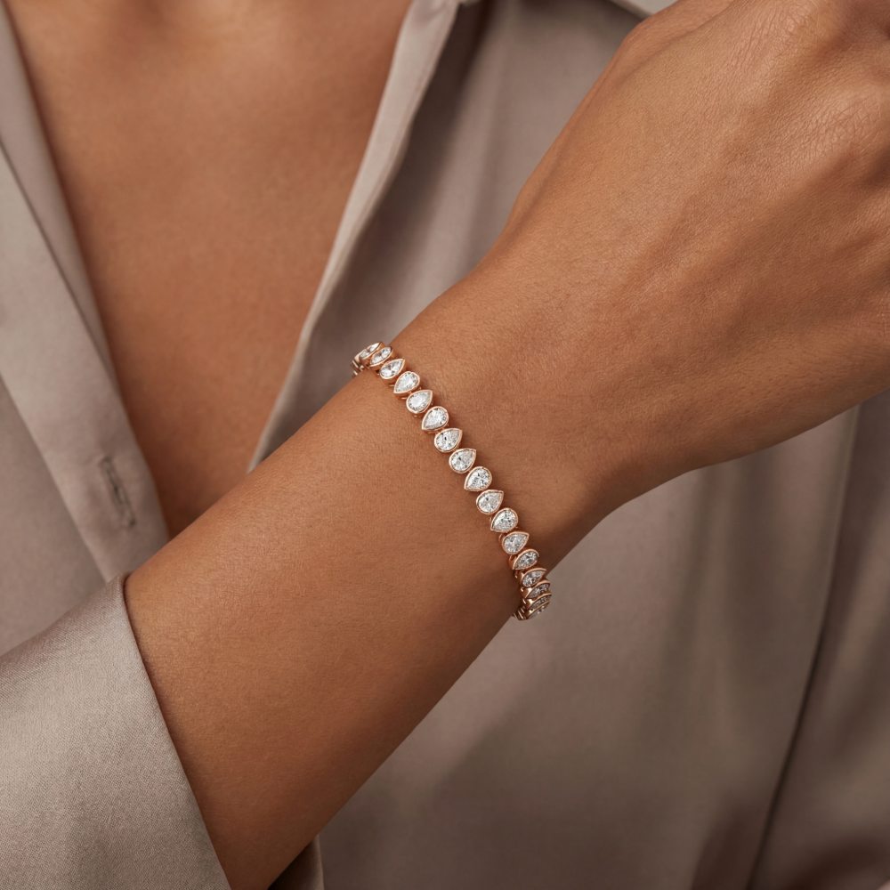 Außergewöhnliches Armband mit einer Reihe ausdrucksstarker Diamanten im Tropfenschliff. In feinster Machart aus 18-karätigem Roségold gefertigt. Ein besonderes Statement-Piece!