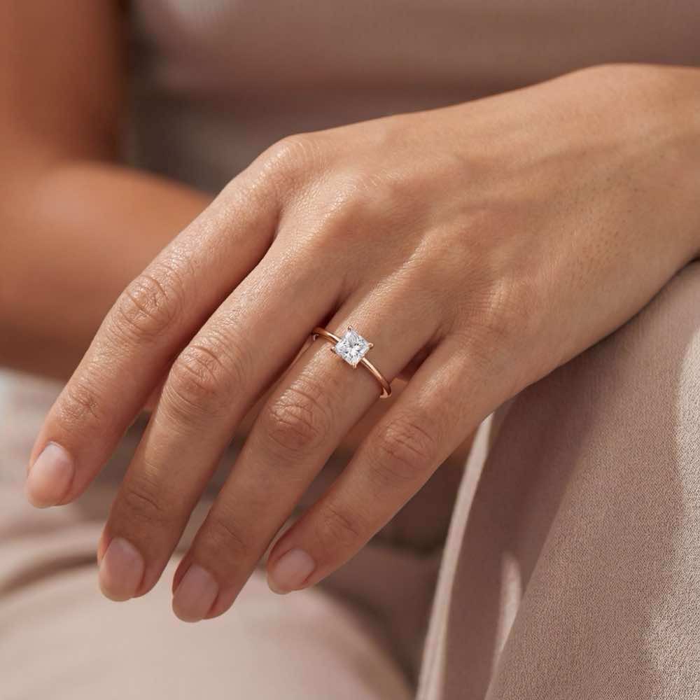 Stilvoller Solitärring mit einem weißen Diamanten im funkelnden Princess-Cut. Eine edle und schlichte Fassung, gearbeitet aus hochwertigem Roségold 750/-, bringt den strahlenden Brillanten besonders gut hervor.