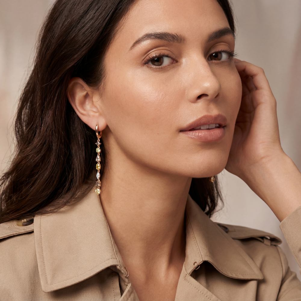 Charmante Ohrringe mit weißen und fantasiefarben gelben und braunen Diamanten. Durch die verschiedenen Schliffformen und die Beweglichkeit aller Diamanten besticht dieser Ohrschmuck durch eine wunderschöne Leichtigkeit. In feiner Atelier-Handarbeit aus edlem 18-karätigen Roségold gearbeitet.