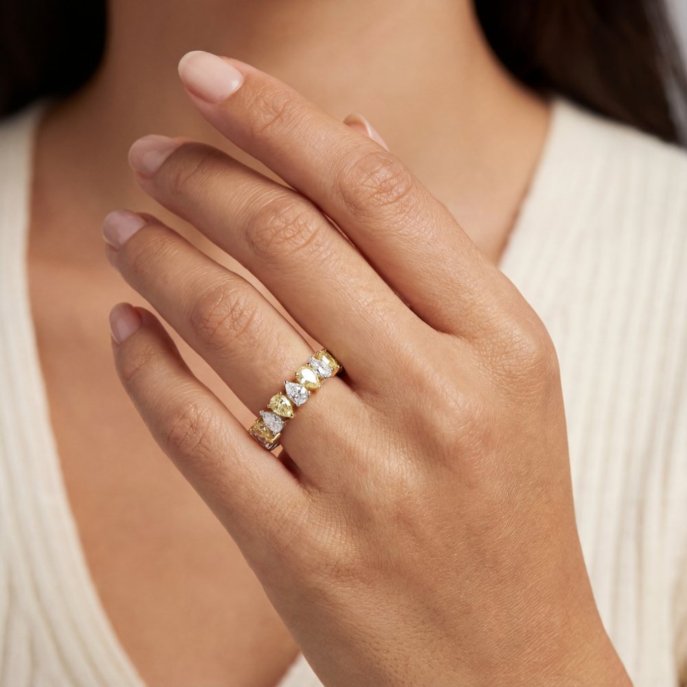 Ein wunderschöner Ring mit rundum über 2 ct. fantasiefarben gelber und weißer Diamanten. In feiner Atelier-Handarbeit aus edlem 18-karätigen Gelb- und Weißgold gearbeitet.