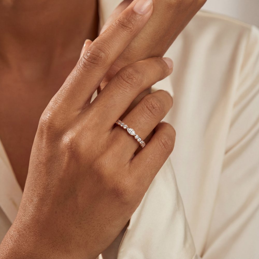 Klassischer Memoire-Ring mit einem charmantem Zusammenspiel aus Diamanten im Navette-, Baguette- und Brillant-Schliff. In feiner Atelier-Handarbeit aus edlem 18-karätigen Roségold gearbeitet.