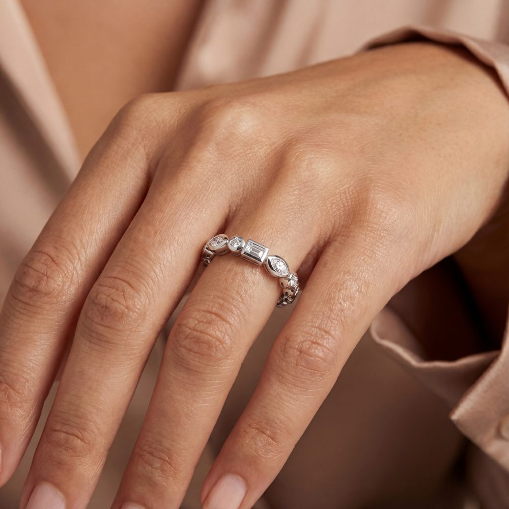 Klassischer Memoire-Ring mit einem charmantem Zusammenspiel aus Diamanten im Navette-, Baguette- und Brillant-Schliff. In feiner Atelier-Handarbeit aus edlem 18-karätigen Weißgold gearbeitet.