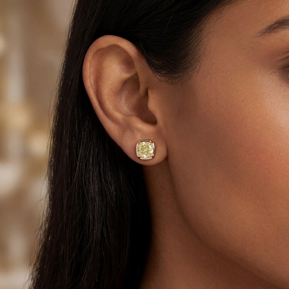 Außergewöhnlicher Ohrschmuck mit fantasiefarben gelben Diamanten im Kissen-Schliff von zusammen über 3 ct. Gewicht. In feiner Atelier-Handarbeit aus edlem 18-karätigen Roségold ggearbeitet.