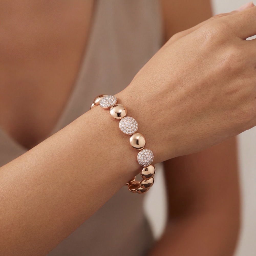 Sportlich-schicke Armspange mit fein weißen Diamanten in einem ausdrucksstarken Pavée-Setting. In feiner Atelier-Handarbeit aus edlem 18-karätigen Roségold gearbeitet.