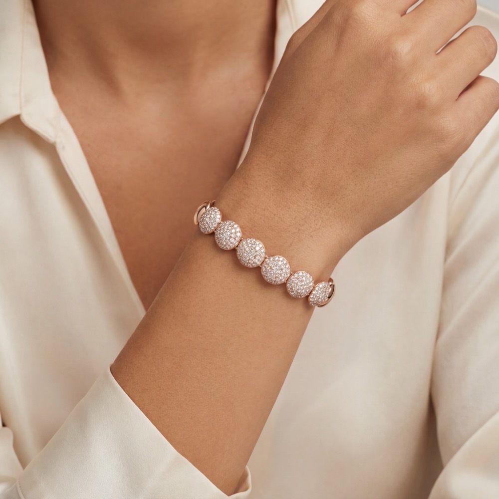 Sportlich-schicke Armspange mit fein weißen Diamanten in einem ausdrucksstarken Pavée-Setting. In feiner Atelier-Handarbeit aus edlem 18-karätigen Roségold gearbeitet.