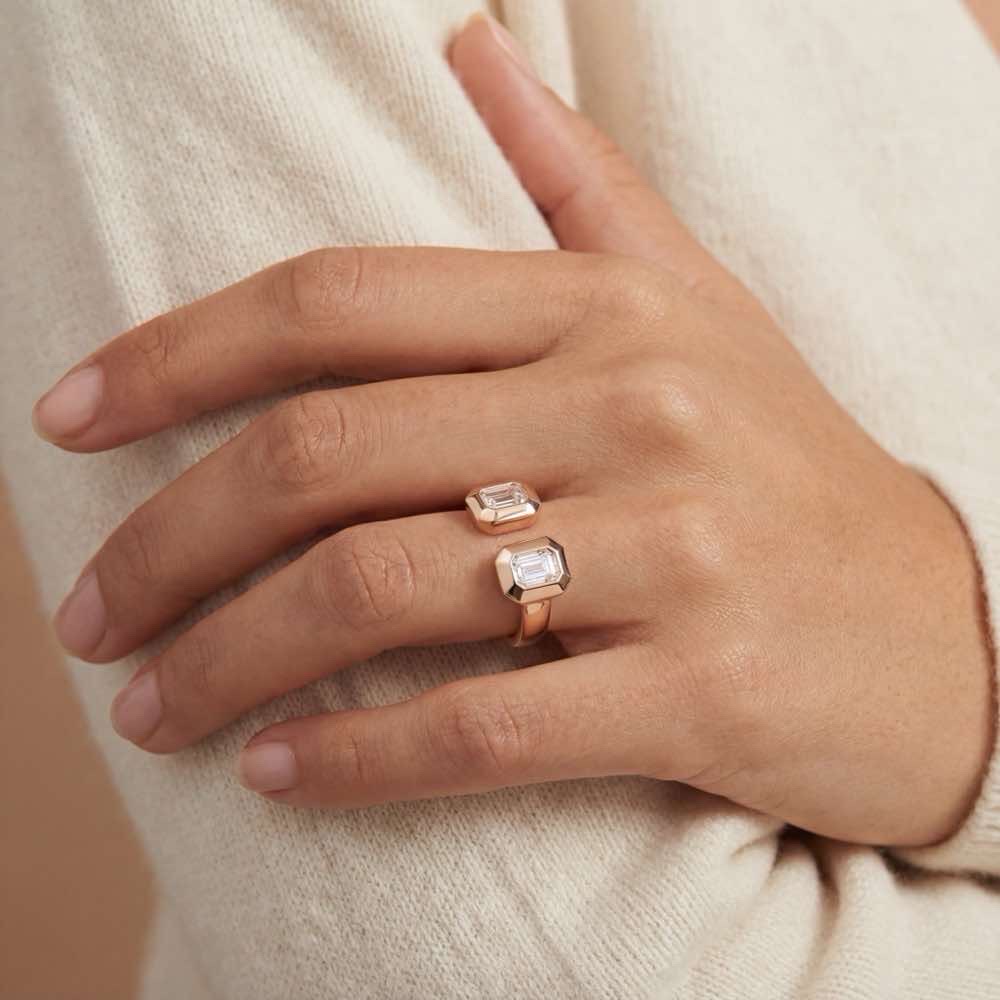 Ausdrucksstarker Ring aus 18-karätigem Roségold mit zwei Diamanten im eleganten Emerald-Schliff. Die raffinierten Steine verleihen dem Design eine zeitgemäße Klarheit und eine faszinierende Tiefe – ein Statement von Stil und Charakter.