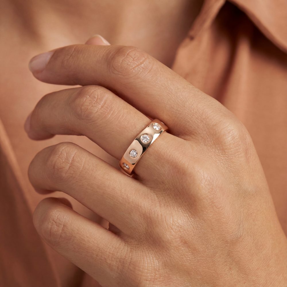 Schlichter Ring aus 18-karätigem Roségold mit sieben funkelnden Brillanten. Das facettenreiche Lichtspiel der Steine bringt eine außergewöhnliche Brillanz zum Ausdruck – dezent, edel und wirkungsvoll.
