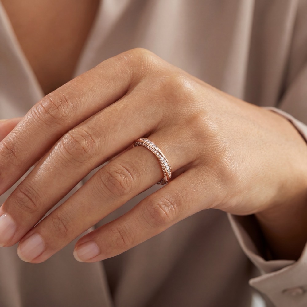Raffiniert verschlungener Memoire-Ring mit funkelnden Brillanten. In feiner Atelier-Handarbeit aus edlem 18-karätigen Roségold gearbeitet.