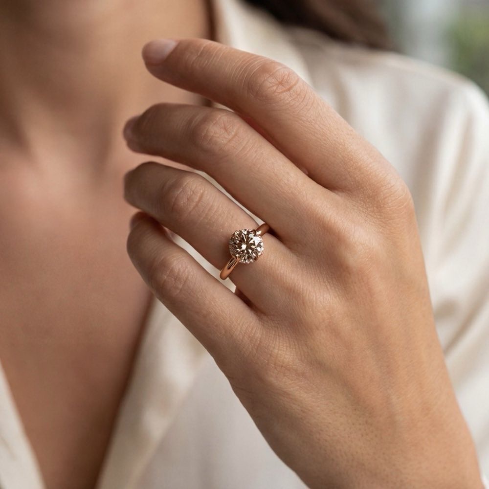 Bezaubernder Ring mit einem fantasiefarben braunen Diamanten im Brillantschliff im Zentrum. Unter dem Mittelstein verläuft dezent und zart ein Kranz aus fein weißen Diamanten. Ein charmanter Kontrast zu dem warmen und 18-karätigen Roségold.