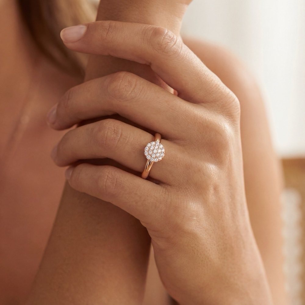 Bezaubernder Ring mit weißen Diamanten im Brillantschliff. Gefertigt aus warmem 18-karätigen Roségold.