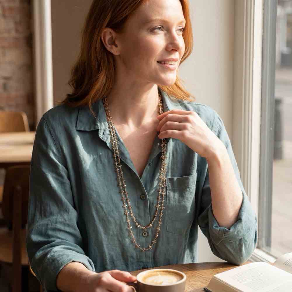 Ein stilvolles Collier in 102cm Länge mit unzähligen, zimtfarbenen Brillanten. Gefasst in warmem Roségold 750/-. Einreihig lang oder auch doppelreihig kurz tragbar. Dieses außergewöhnliche Collier veredelt charmant Ihre Garderobe und ist ein Begleiter für jeden Tag.