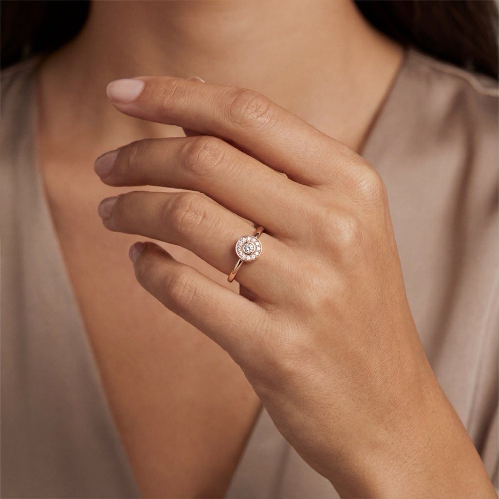 Klassischer Ring mit einem weißen Diamanten im Zentrum, umrahmt von weiteren 11 Diamanten. In feiner Atelier-Handarbeit aus edlem 18-karätigen Roségold gearbeitet.