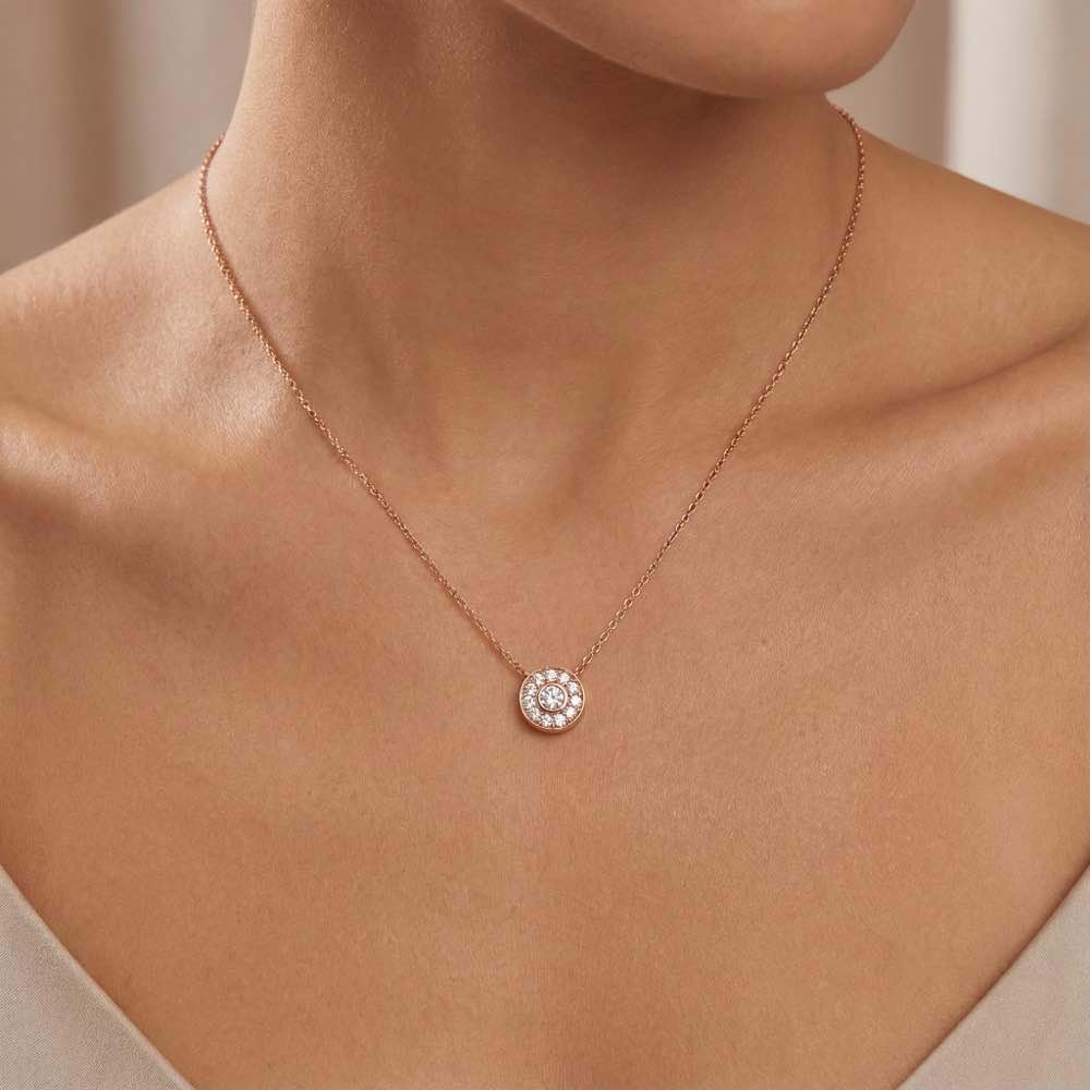 Klassischer Anhänger mit einem weißen Diamanten im Zentrum, umrahmt von weiteren Diamanten. In feiner Atelier-Handarbeit aus edlem 18-karätigen Roségold gearbeitet.