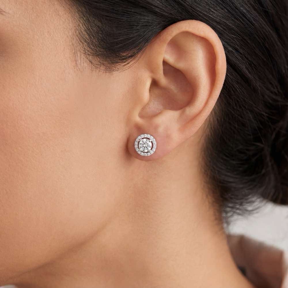 Klassischer Ohrschmuck mit einem weißen Diamanten im Zentrum, umrahmt von weiteren Diamanten. In feiner Atelier-Handarbeit aus edlem 18-karätigen Weißgold gearbeitet.