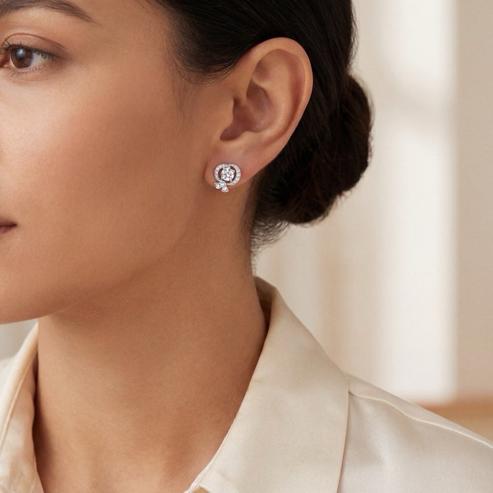 Charmanter Ohrschmuck mit einem weißen Diamanten im Zentrum, umrahmt von weiteren Diamanten. In feiner Atelier-Handarbeit aus edlem 18-karätigen Weißgold gearbeitet.