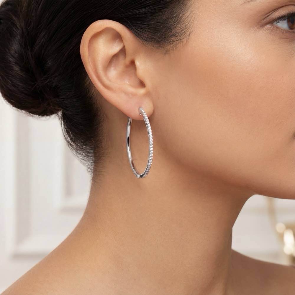 Sportliche und stilvolle Creolen mit weißen Diamanten. In feiner Atelier-Handarbeit aus edlem 18-karätigen Weißgold gearbeitet.