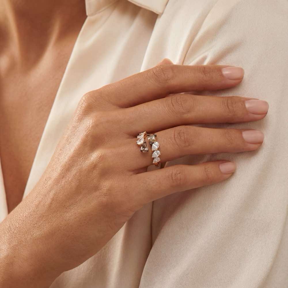 Außergewöhnlich verarbeiteter Ring mit einem sinnlichen Zusammenspiel aus fantasiefarben braunen und fein weißen Diamanten. Très chic!
