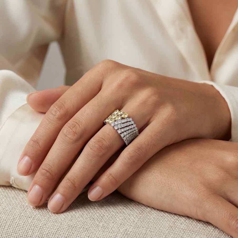 Außergewöhnlich verarbeiteter Ring mit einem sinnlichen Zusammenspiel aus fantasiefarben gelben und fein weißen Diamanten. Très chic!