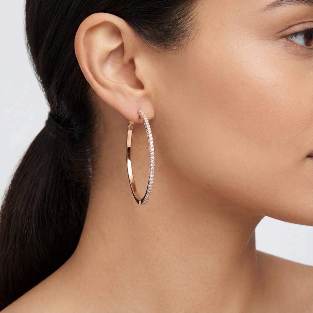 Sportliche und stilvolle Creolen mit weißen Diamanten. In feiner Atelier-Handarbeit aus edlem 18-karätigen Roségold gearbeitet.