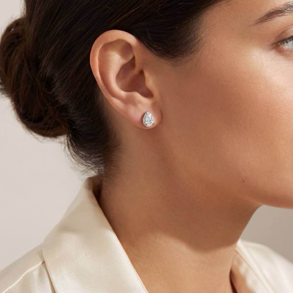 Charmante Ohrstecker mit weißen Diamanten im Tropfenschliff sowie seitlichen Diamanten im Brillantschliff. Dank ihrer Machart sitzen sie als täglicher Begleiter perfekt auf dem Ohrläppchen. In feiner Atelier-Handarbeit aus edlem 18-karätigen Weißgold gearbeitet.