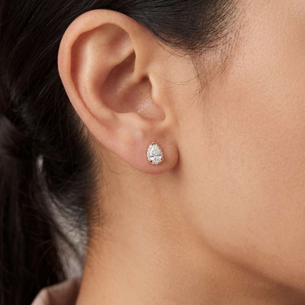 Charmante Ohrstecker mit weißen Diamanten im Tropfenschliff sowie seitlichen Diamanten im Brillantschliff. Dank ihrer Machart sitzen sie als täglicher Begleiter perfekt auf dem Ohrläppchen. In feiner Atelier-Handarbeit aus edlem 18-karätigen Roségold gearbeitet.