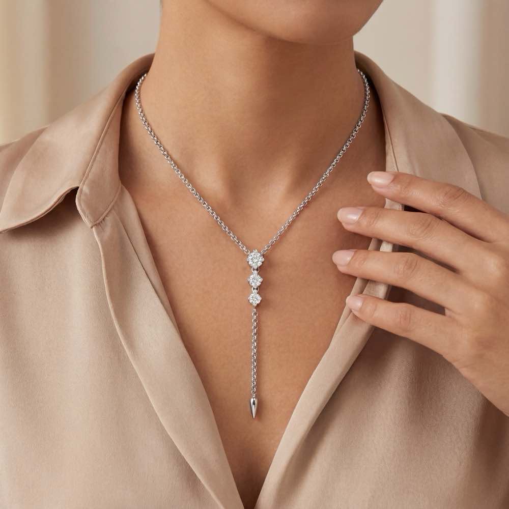 Schicker Halsschmuck in modernem Look mit drei weißen Brillanten, gefertigt im eigenen Atelier in hochwertigem Weißgold 750/-.