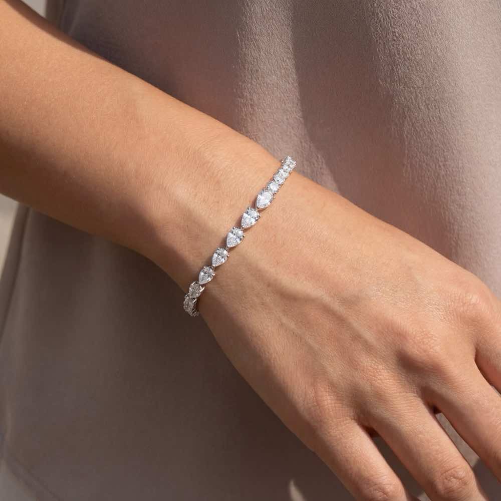 Außergewöhnlich charmantes Armband mit im Wechsel aneinandergereihten, fein weißen Brillanten sowie Diamanttropfen. In traditioneller Goldschmiedekunst und feinster Qualität aus edlem Weißgold 750/- gefertigt.