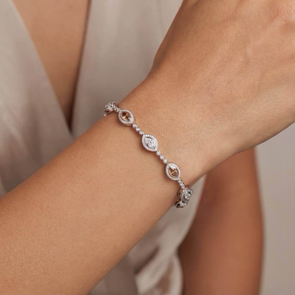 Charismatisches und verspieltes Armband aus weißen und braunen Diamanten, zum Teil im Navette-Schliff. In feiner Handarbeit gefertigt aus Weiß- und Roségold 750/-.
